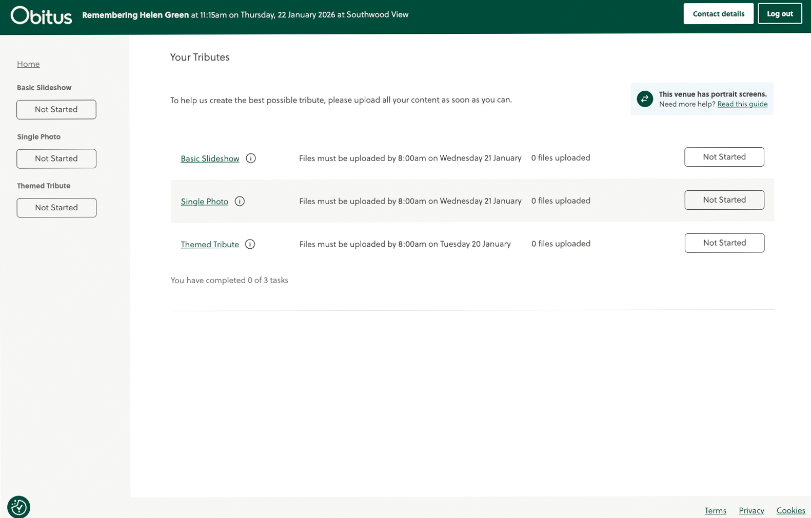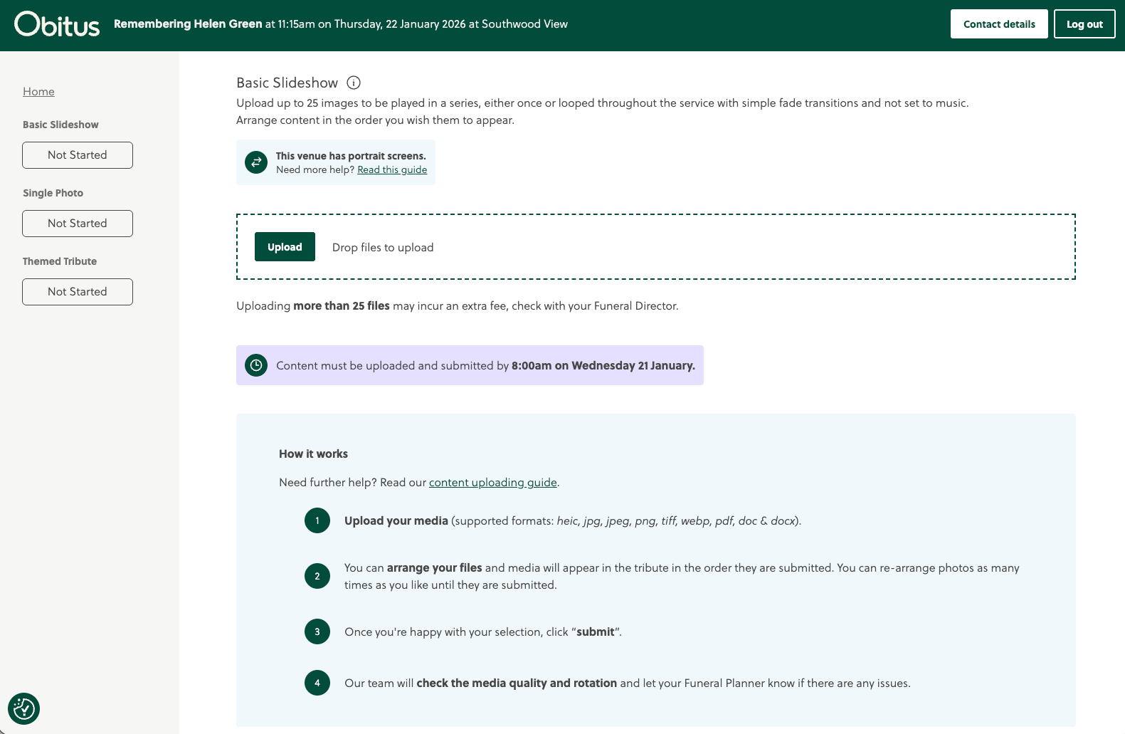 Once logged in, you’ll see the name, date and venue of the person whose service this content is for, and a list of any Visual Tributes ordered.
