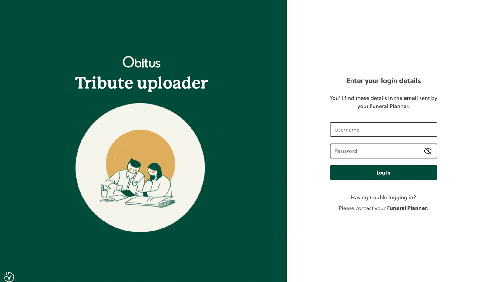 You will receive an email from your Funeral Arranger containing a Username and Password for the Tribute uploader.